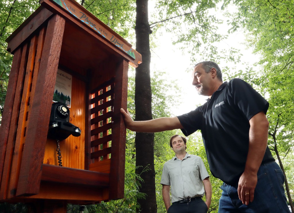 The Phone of the Wind is an initiative of the Crossroads Hospice Society that gives visitors to the park an opportunity to work through some of their grief at losing a loved one by placing a call to them from the vintage rotary-dial wall phone mounted in a wonderfully stained and lacquered wooden booth.